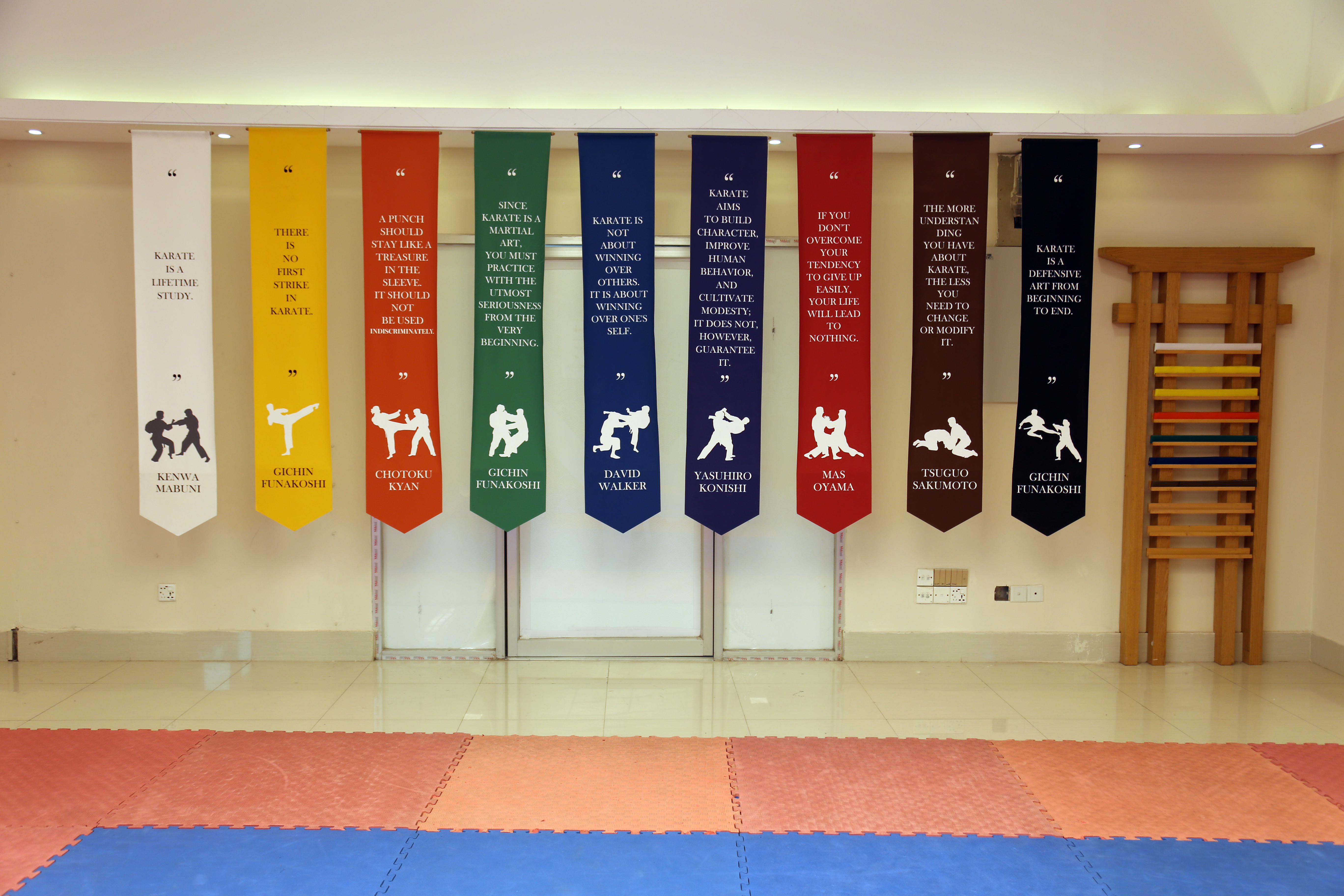 Our logo conveys the principle of self-building through succession under the guidance of different belts and their teaching methods. The human figure in Mawashi Geri kick, breaking out of the red circle, represents that this art of karate also assists our students to create a firm stance in society, confidently facing and going beyond the adversities of stereotype mindset.
