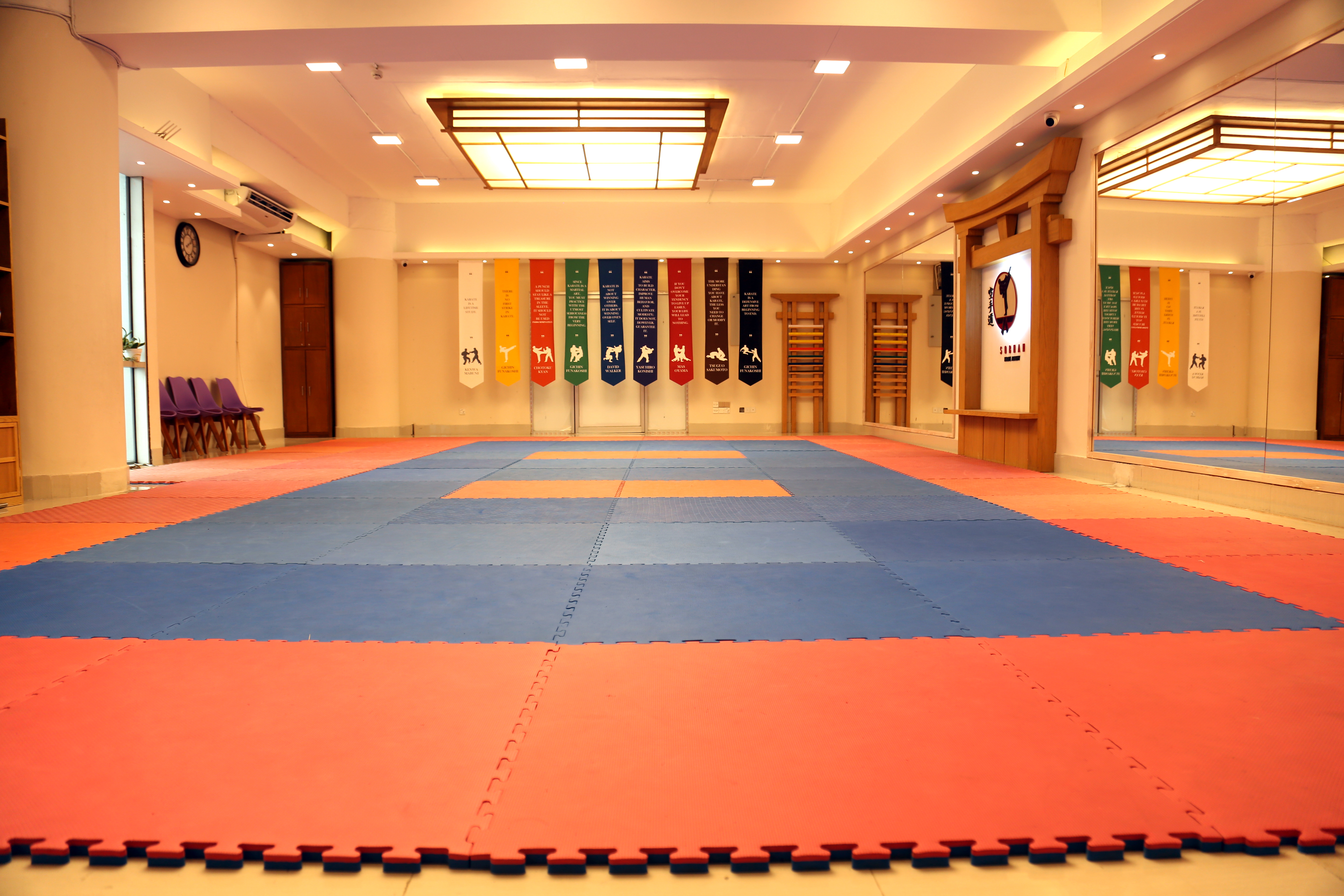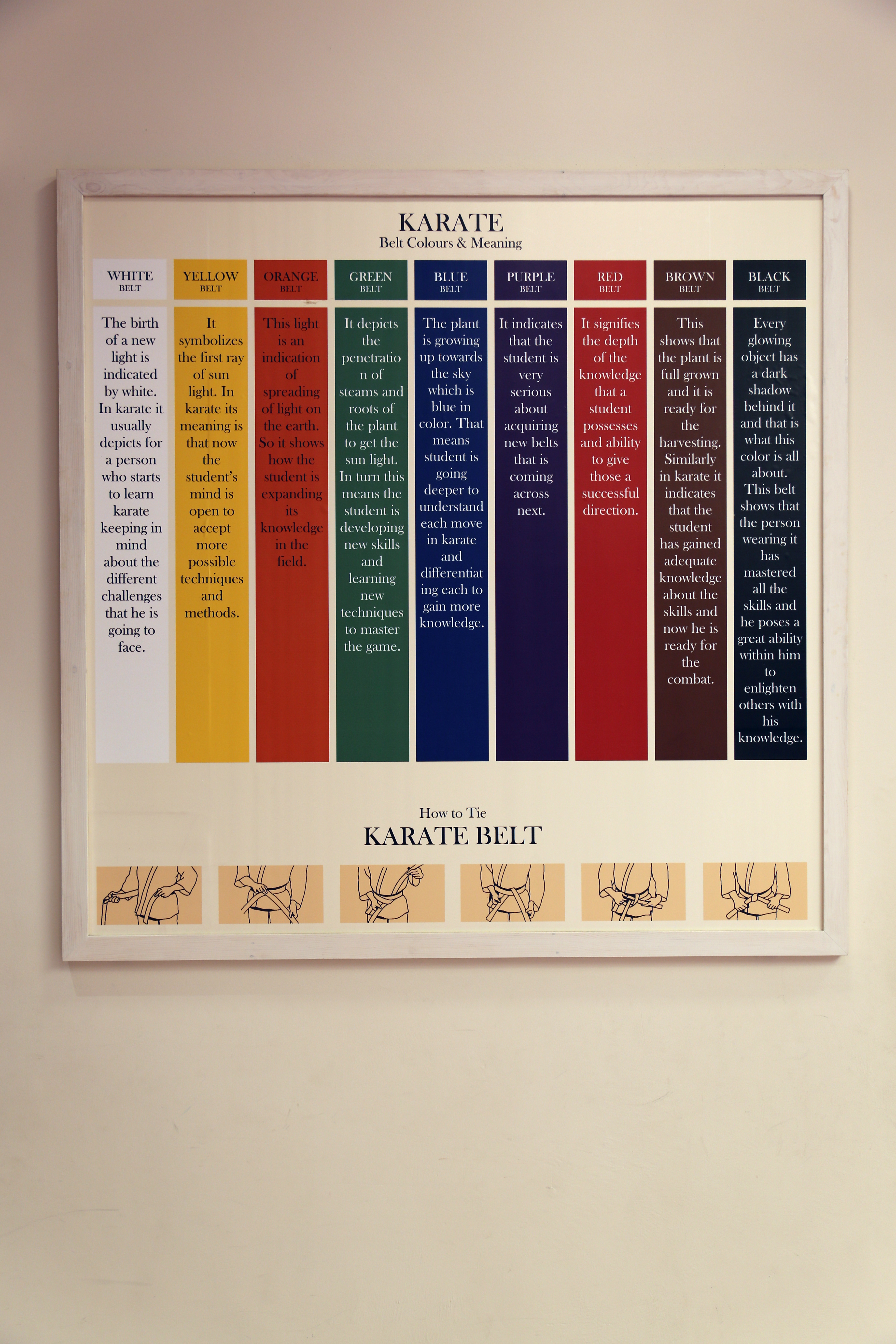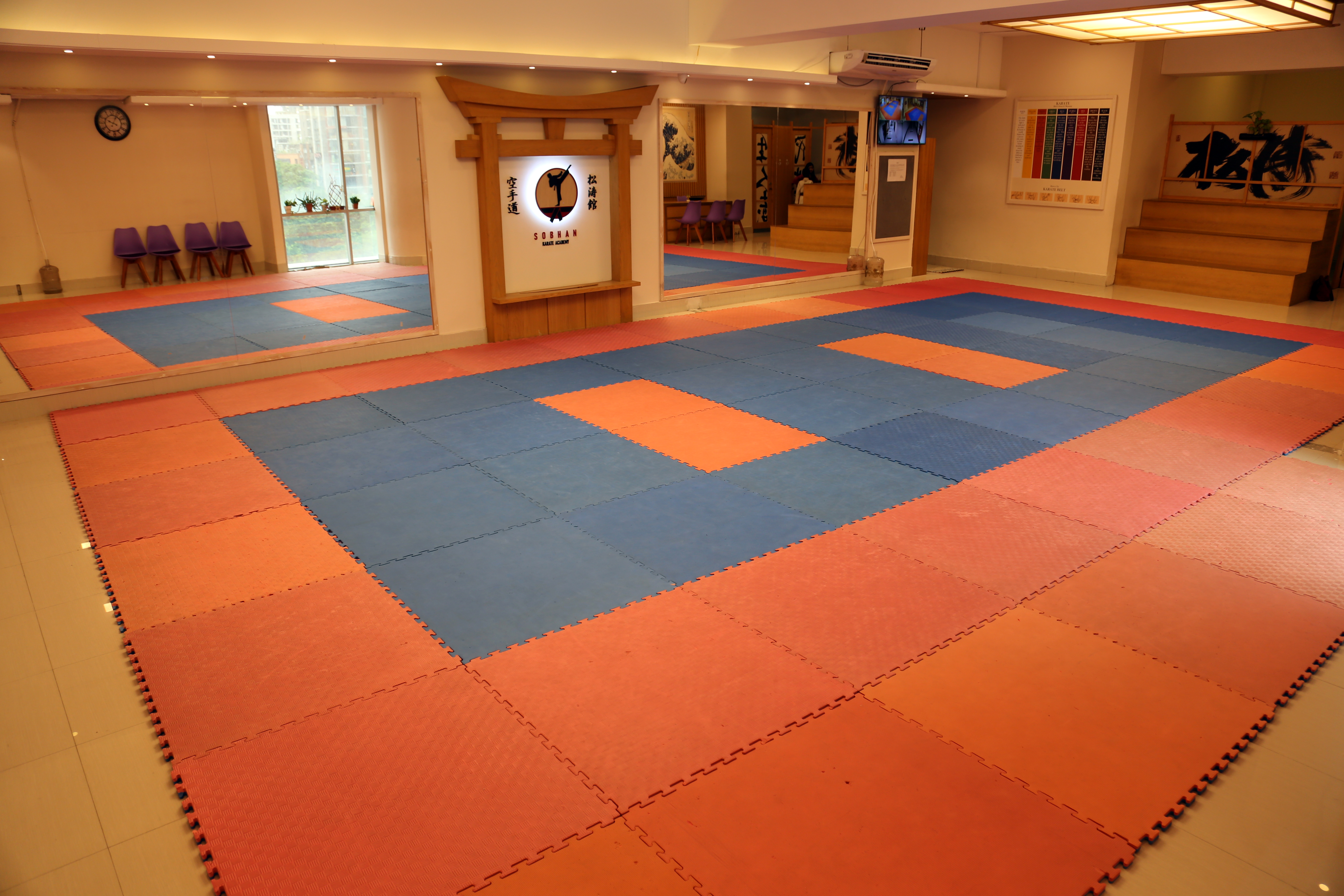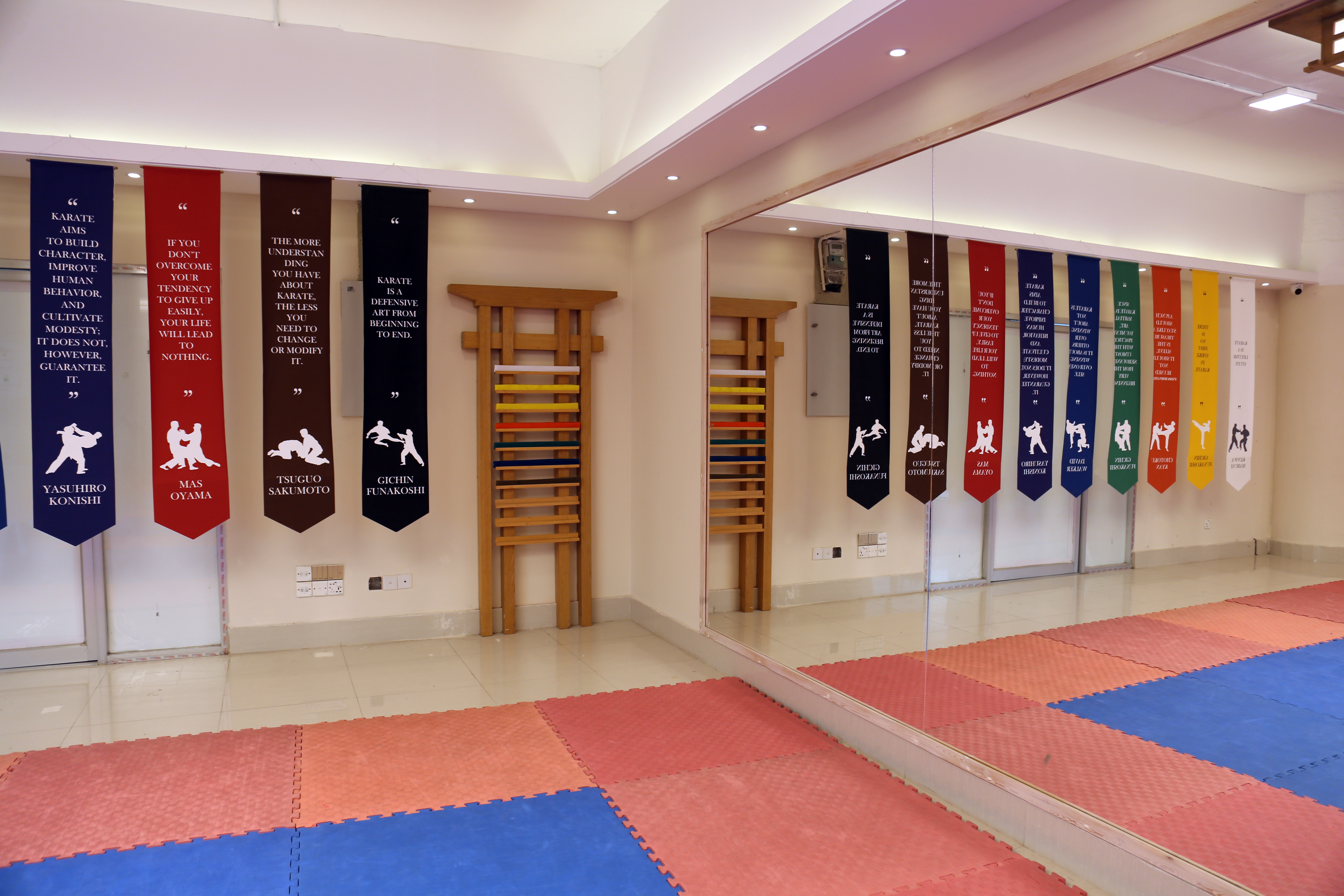 Our logo conveys the principle of self-building through succession under the guidance of different belts and their teaching methods. The human figure in Mawashi Geri kick, breaking out of the red circle, represents that this art of karate also assists our students to create a firm stance in society, confidently facing and going beyond the adversities of stereotype mindset.